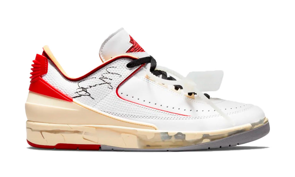 Virgil Abloh og Jumpan-mærket er endnu engang gået sammen om en ikonisk silhuet. Air Jordan 2 - released i 1986 og opfølgeren til den klassiske 1'er - får en vintage fortolkning, hvilket kommer til udtryk med den gullige sål og mærker på midsole. Nuancer i hvid og rød pryder overdelen - og resultatet er en rigtig dope og original sneaker. De er også released i en mørk udgave.