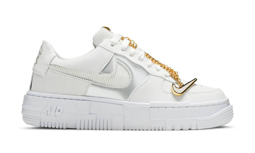 Efter den populære Air Jordan 1 Mid fik en smykke-makeover, er det nu blevet Air Force 1s tur. Det er den nye Pixel model, som ifølge Nikes egne ord er "skabt af og til kvinder". Det eksklusive swoosh smykke hænger på den venstre sko, imens laces har fået monteret gyldne lacetips på begge. En rigtig fresh release.