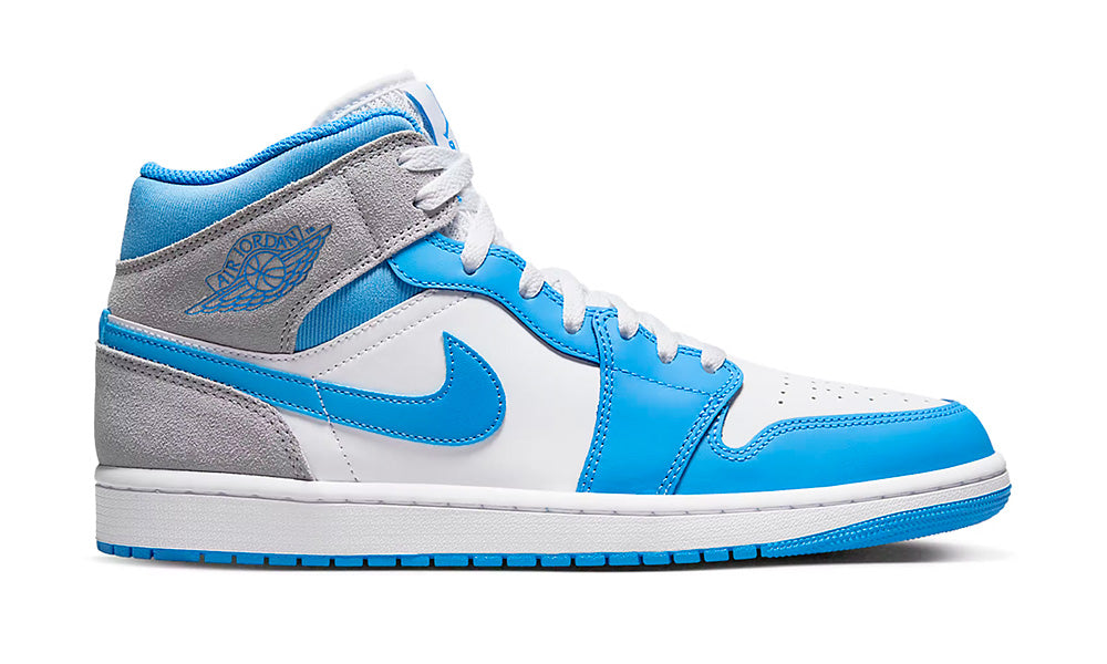 Babyblå, grå og hvid udgør farvekombination på denne sprøde Air Jordan 1 Mid. Skoene har et ultra friskt udtryk - særligt til en solrig dag med blå himmel. Udvid din rotation med en stilren sneaker.
