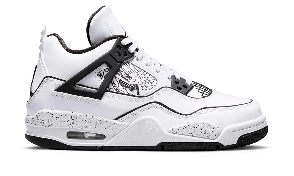 Den populære Air Jordan 4 releaser i en sjov konceptual udgave, hvor midpanel er baseret på et skitseformat, hvor man har mulighed for selv at male dem (hvis man har lyst!). Du kan derfor slippe dit indre barn løs - og give dem lige de farver du synes er passende. Men selv i simple sort/hvide design kan skoene noget.