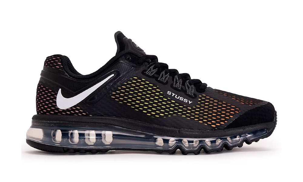 Air Max 2013 er en af de mere undervurderes Air Maxes igennem tiden. Det amerikanske streetwear-brand Stussy har spottet netop det, og lancerer derfor 3 sprøde colorways i den kølige silhuet. Denne udgave er baseret på et sort design med et gradient print i gul og orange i de små perforeringer.