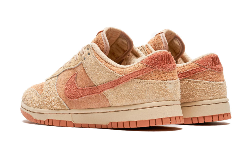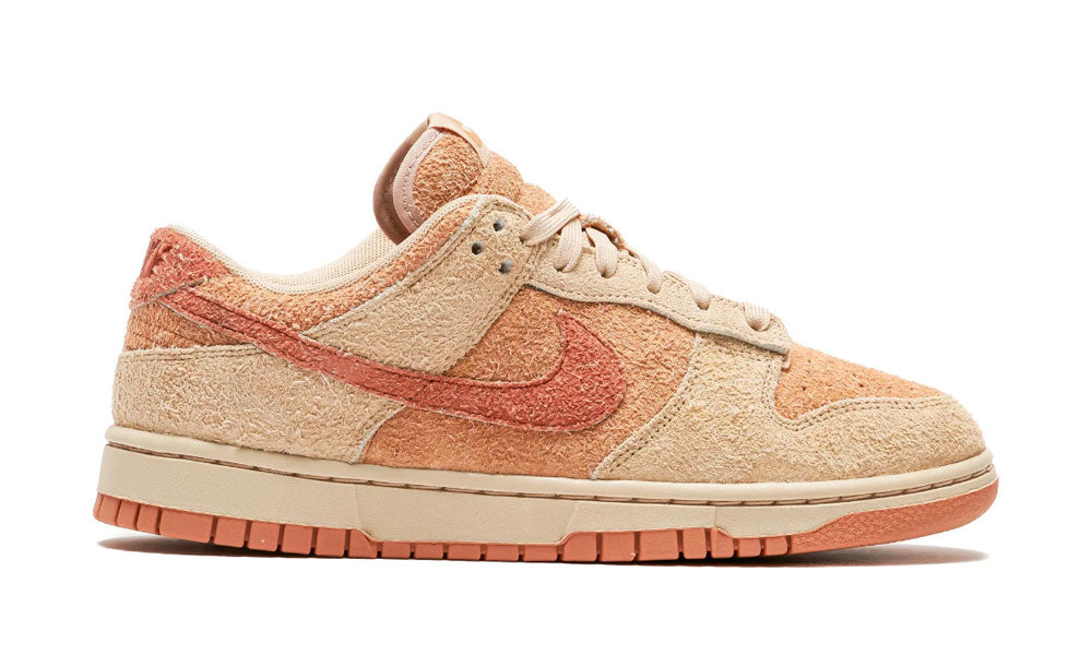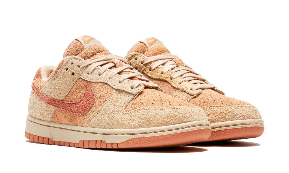 Nike Dunk Low "Burnt Sunrise" er fremstillet med overdeler i premium pelset ruskind, mens brændte nuancer af orange og tan udgør basen og overlays. En mørkere orange nuance findes på panelets Swoosh og hæl — sidstnævnte inkluderer også et broderet Nike-hællogo — mens yderligere branding ses på tungetags og indersåler. Skoen hviler på en komplementær tan mellemsål og orange ydersål, mens matchende tan snørebånd binder det hele sammen for en pæn afslutning.