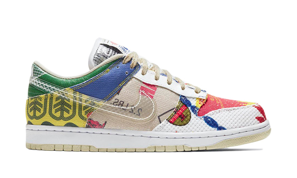 Nike Dunk Low "City Market" hylder diversiteten i de mange materialer, Nike har brugt gennem tiden. Skoen er konstrueret i upcycled kanvas-materialer, hvor den designmæssige inspirationen er taget fra verdens farvefyldte markeder. Et sjovt og anderledes take på en klassiker.