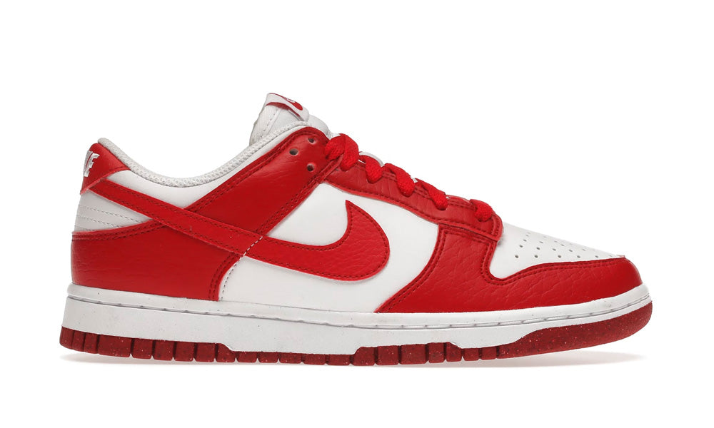 Nikes Next Nature-serie fokuserer på bæredygtighed og upcycling. Derfor er dele af skoene konstrueret i genbrugsmaterialer. Dette release er lavet med en hvid base samt paneler i distressed rødt læder. En ultra fresh Dunk Low.