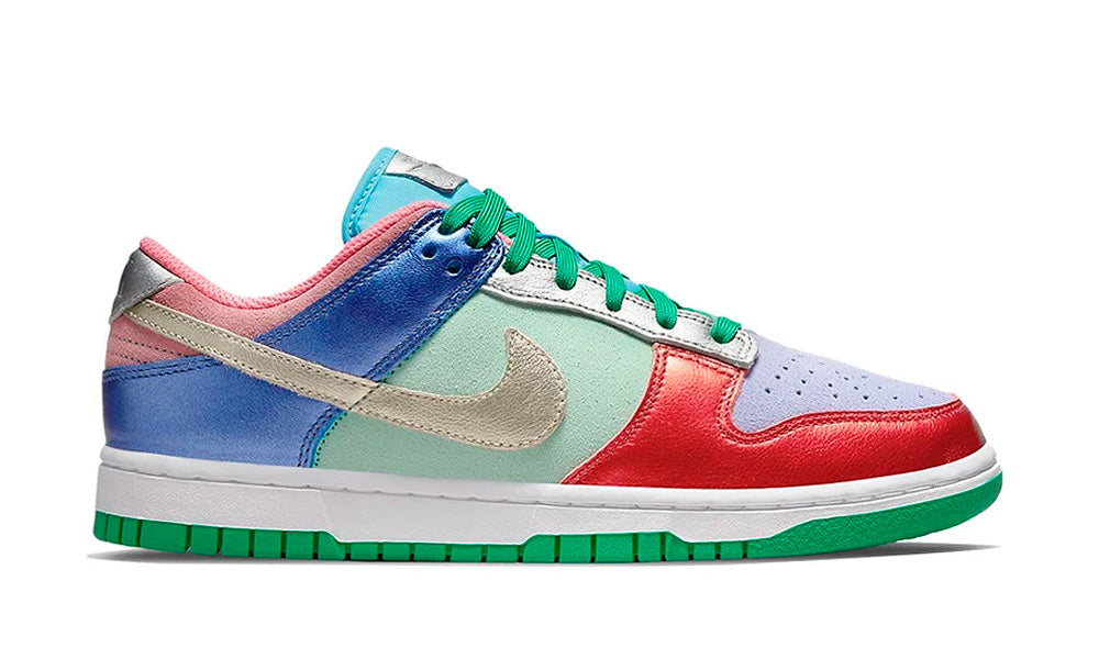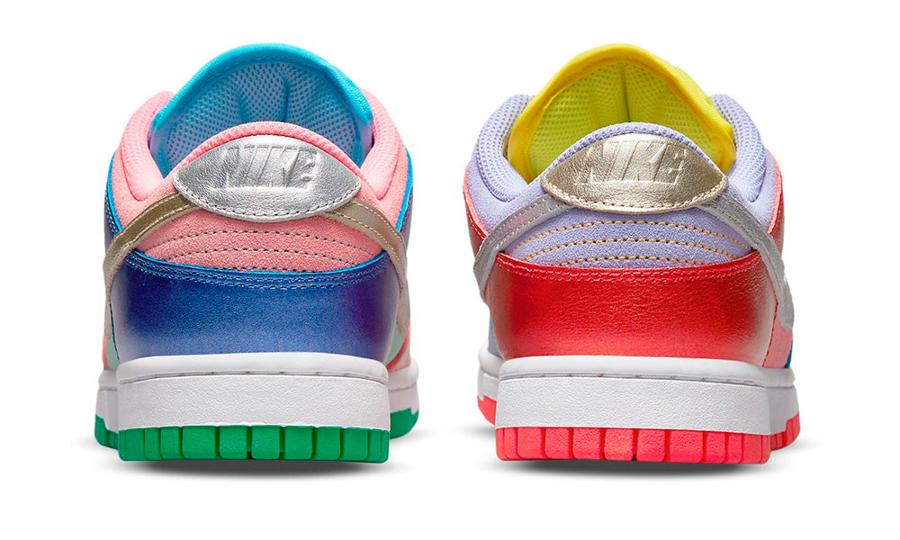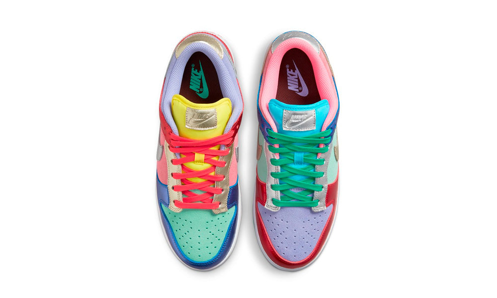 En festlig Dunk Low er landet med Sunset Purple-farvekombinationen. Konceptet er to mistmatched sneakers i et disko-inspireret tema. Det er en ren farveeksplosion med bl.a rød, blå, turkis, gul, pink, grøn, sølv, lilla og mint. En sneaker der med garanti vil give opmærksomhed!