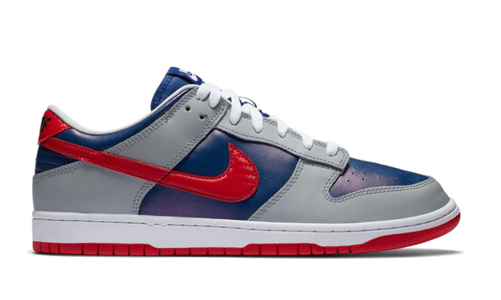 Nike Dunk Low "Samba" udkom oprindeligt som en Japan exclusive tilbage i 2001. Det er første gang siden da, at colorwayen bliver retroet - men nu er tiden endelig kommet. Skoene er konstrueret i læder med paneler i mørkeblå og grå samt med rødt swoosh og sål. En sprød Dunk Low med fed colorblocking.